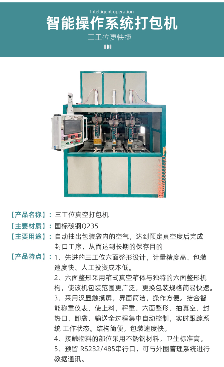 3、采用漢顯觸摸屏,界面簡(jiǎn)潔,操作方便。結(jié)合智能稱重儀表、使上料,秤重.六面整形、抽真空、封熱口、卸袋、輸送全過(guò)程集中自動(dòng)控制,實(shí)時(shí)跟蹤系統(tǒng) 工作狀態(tài)。結(jié)構(gòu)簡(jiǎn)便,包裝速度快。